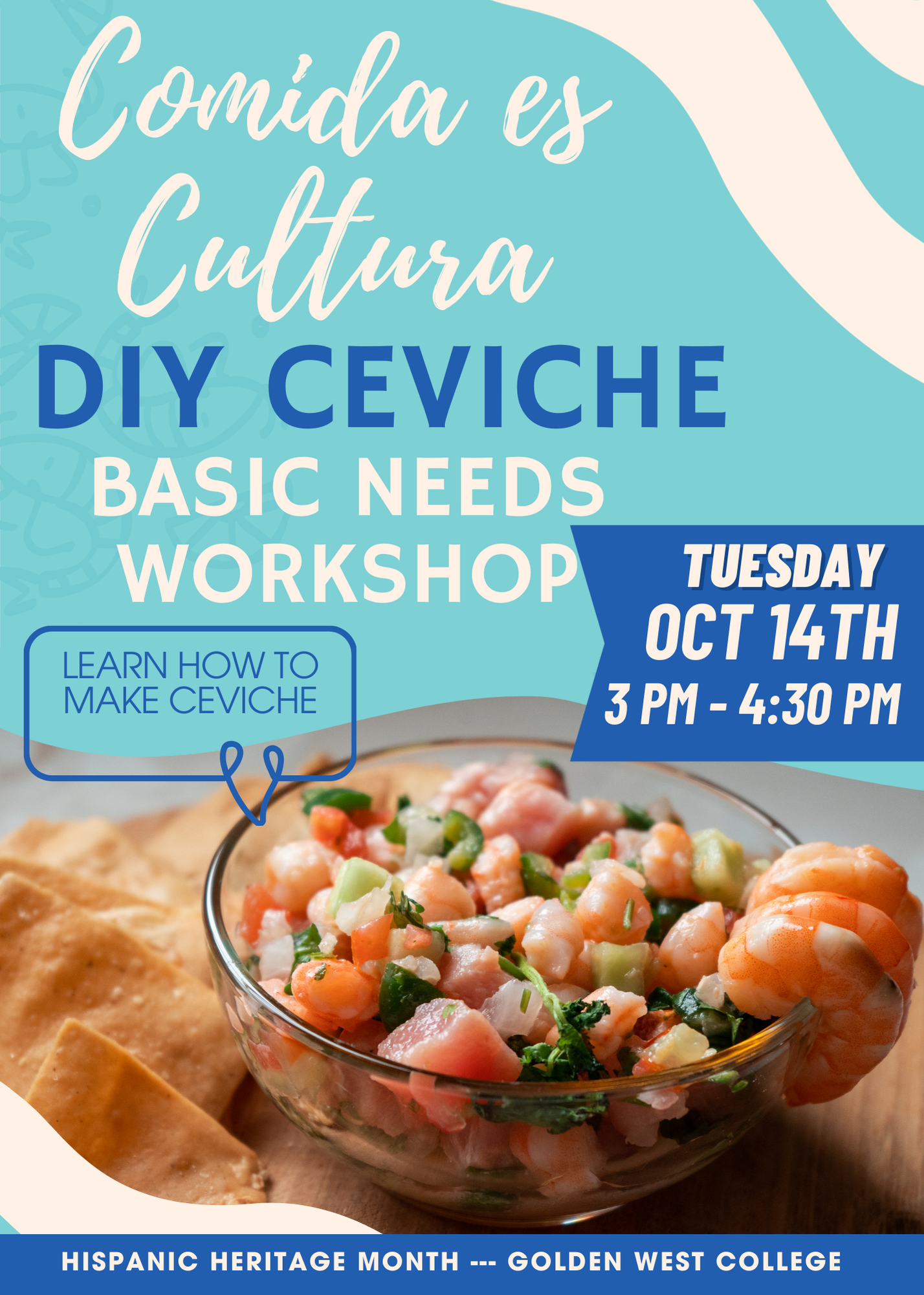 Celebrate Hispanic Heritage Month with a hands-on ceviche making workshop. Learn the history behind the dish, prepare your own serving, and take home a recipe card. The Basic Needs Center will share resources and host a short presentation. After the workshop, visit The Stand to explore food support and other services available to students. The event will take place outdoors by the Student Union side tables facing The Stand.